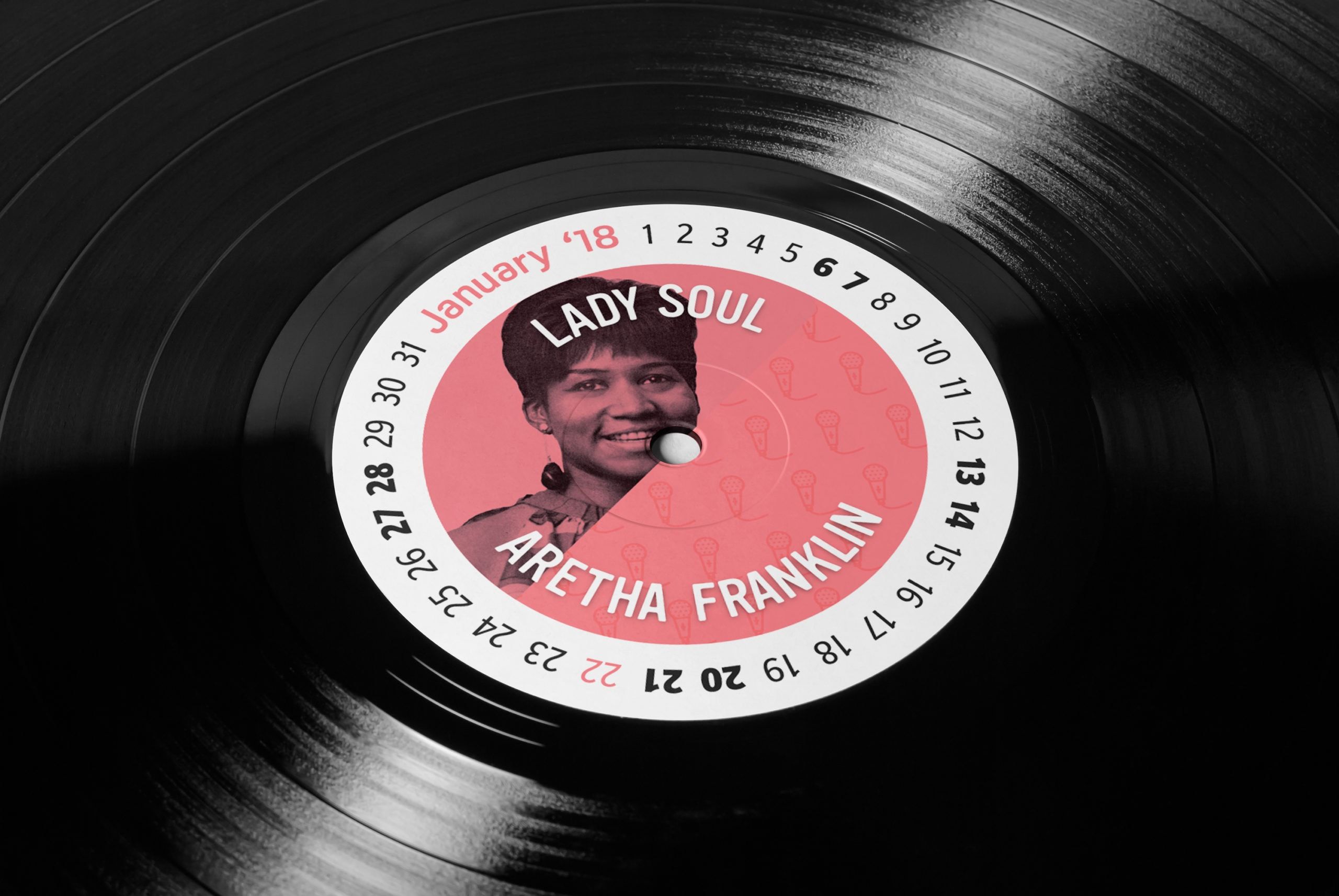 Music history calendar. Based on music history, this is a unique format for the conventional calendar structure. The design pairs critically acclaimed album releases from the past with months of the year. The final product is a set of six double-sided, playable vinyl records. This vinyl calendar could be produced as a museum gift shop item for the dedicated music lover.