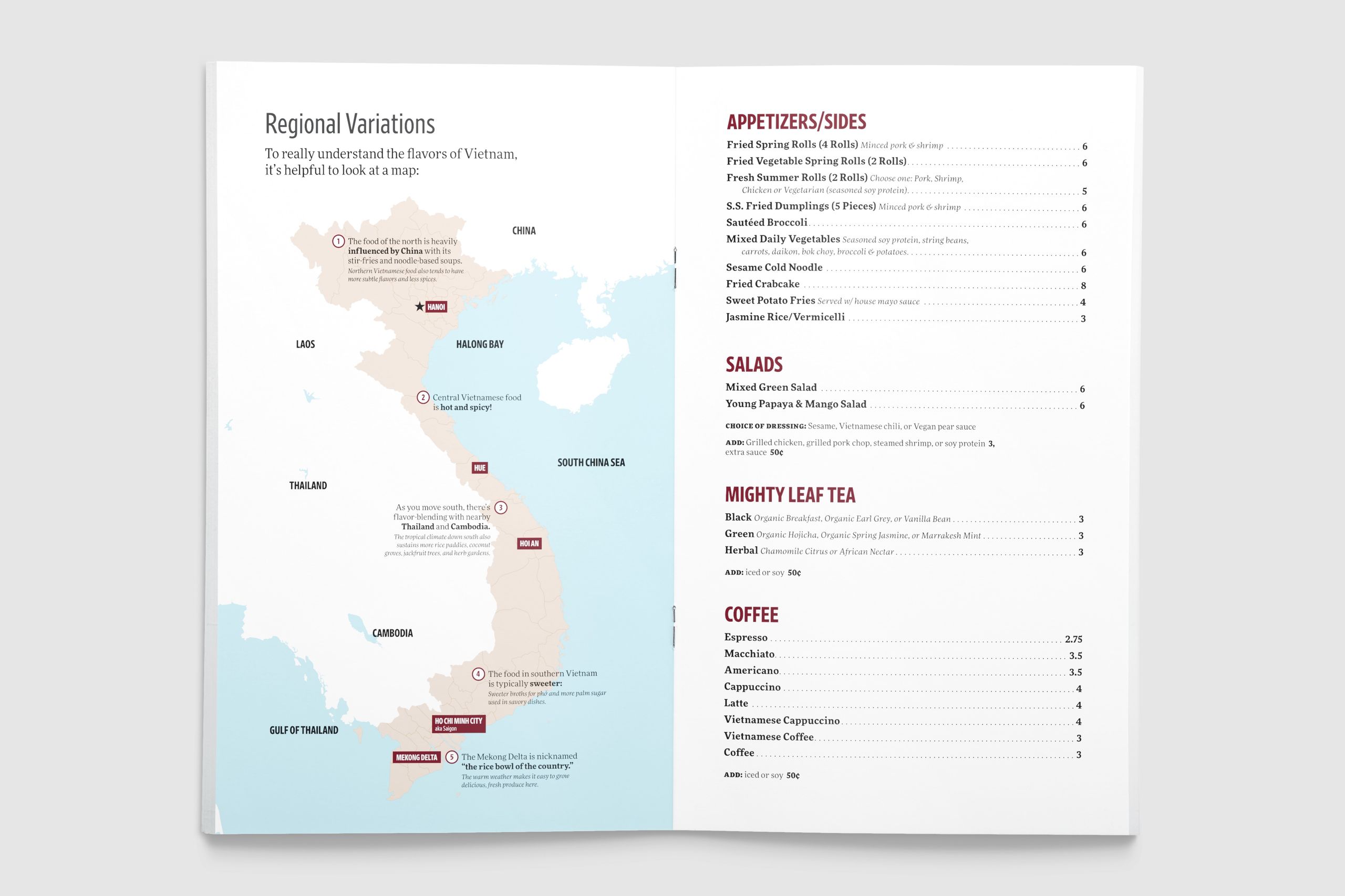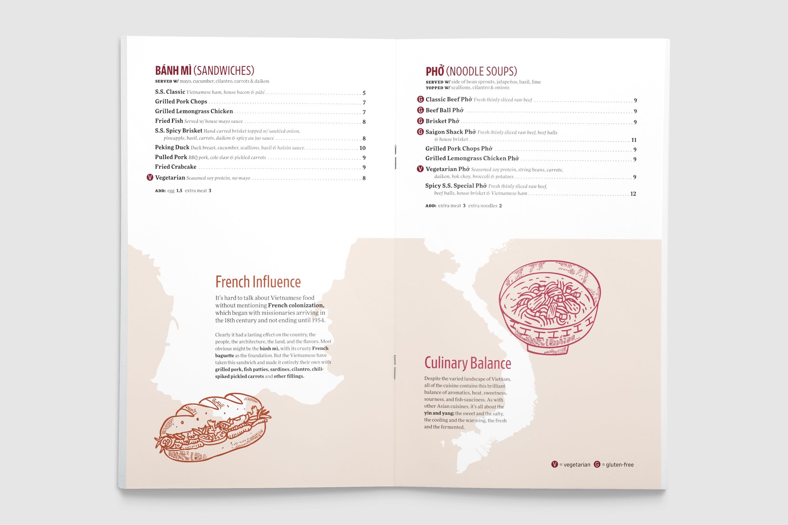 Restaurant identity. Saigon Shack is a casual sit-down Vietnamese restaurant in Greenwich Village, Manhattan. Since the restaurant is only a few blocks from NYU, this menu redesign uses a concept that educates visitors about Vietnamese culture and history to appeal to students and people who are unfamiliar with this type of cuisine.